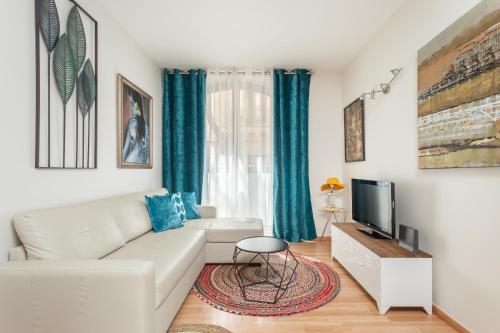 Address: 14, Pasaje Maiol. Set on the first floor, this stylish one-bedroom apartment offers a furnished terrace, as well as air-conditioning and free Wi-Fi. It has a bedroom with a double bed. The apartment is decorated in soft tones and features a parquet floor. The kitchen is fully-equipped, and has a bathroom with a bath tub. The lounge includes sofas as well as a flat-screen TV and a DVD player. This apartment is just 50 metres from Gaudí's iconic Sagrada Família. |