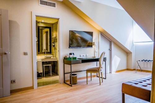 This modern, spacious Suite has a separate lounge with a sofa. There is free internet access and a private bathroom with a hairdryer. Some of these suites have a balcony overlooking the tree-lined Campomanes Street. |