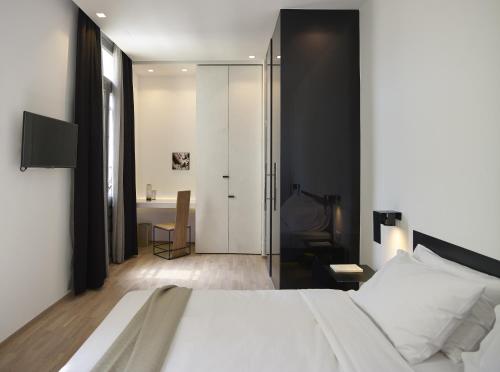 Modernly decorated room with Cocomat mattress and linens, equipped with a satellite, flat-screen TV and free WiFi. The bathroom features marble details and is stocked with Olive amenities. |