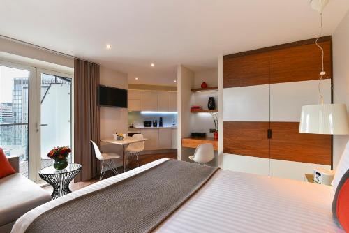 Offering city views, this smart, modern apartment has a double bedroom, a lounge and a fully equipped kitchen. |