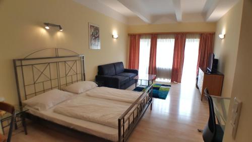 This larger, air-conditioned studio features a kitchen with a dishwasher and a bathroom with bath tub. There is a washing machine available outside of the studio. Please note that 1 child up to the age of 6 years can sleep free of charge in existing beds. Other child can stay on the extra bed available for a surcharge. |