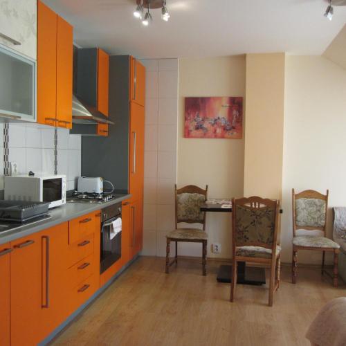 This one bedroom apartment is situated on the mezzanine floor in a completely renovated building with an elevator. Apartment features living room with a comfortable sitting and dining area with kitchen, a separate bedroom for 2 people, platform with 2 beds and a bathroom with a bathtub and toilet. Please note that platform with beds is situated above the living room, and is accessed by a wooden staircase. |