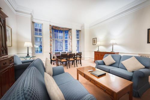 This exceptional, premium serviced apartment features four bedrooms (king, double, twin, twin) and three full sized bathrooms with shower over bath and a walk-in shower. The two reception rooms are laid out as a formal lounge or dining room and a more relaxed TV room. This wonderful self-catering option features fully fitted kitchen with dishwasher and washing machine, four full bedrooms; and three full bathrooms. |