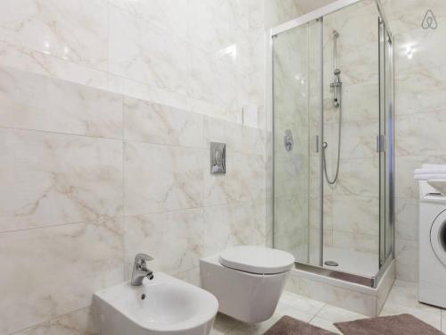 This apartment features a seating area with a flat-screen TV, a kitchen with a dishwasher, and a bathroom fitted with a shower and a bidet. |