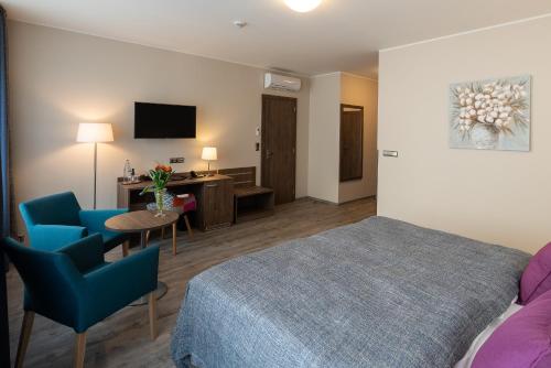 These rooms have satellite TV, big wardrobes and suitcase boxes for luggage. Each room has a desk and chairs, with lamp.
