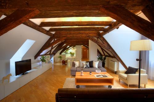 This modern air-conditioned two-bedroom and two-bathrooms apartment is in the attic, and features a fully equipped kitchen, living room with a seating area and home theatre system. Free WiFi is also provided. Please note, there is a staircase that guests have to walk up from the elevator to the apartment. |